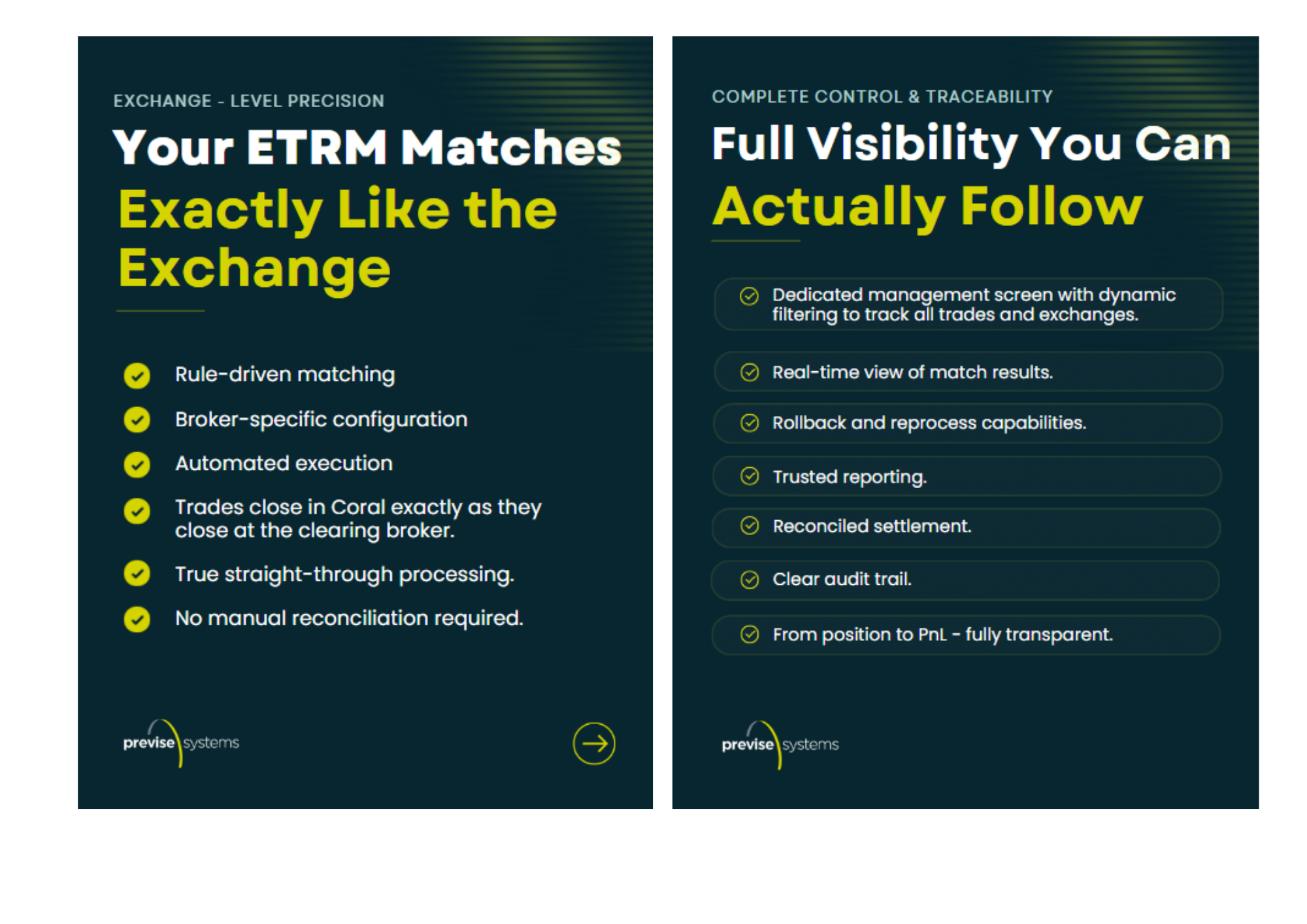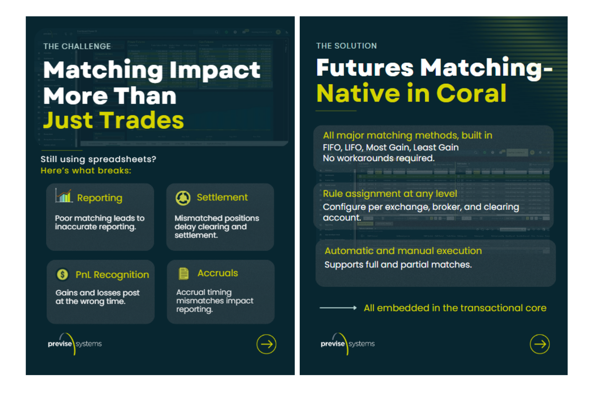 Coral's native futures matching engine fixes this at the root. All major matching methods - FIFO, LIFO, Most Gain, Least Gain - are built in, configurable at the exchange, broker, and clearing account level, and run automatically or manually for full and partial matches. Trades close in Coral exactly as they close at the clearing broker, with real-time match visibility, rollback capabilities, and a clear audit trail from position to PnL. No workarounds. No reconciliation. Straight-through processing, embedded in the transactional core.